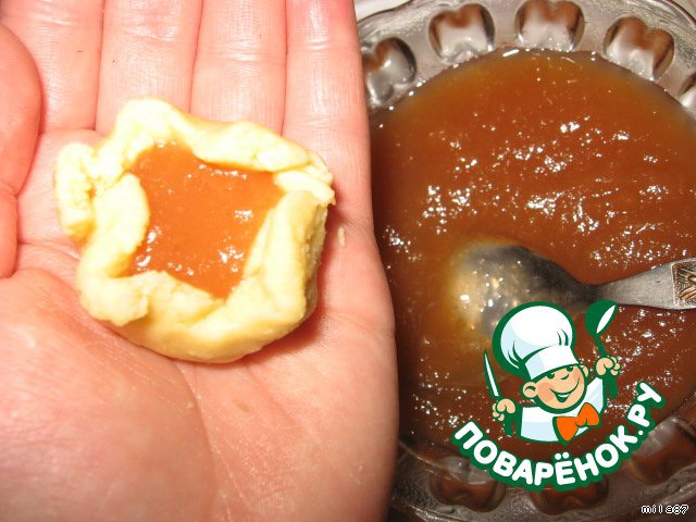 От теста отделяем шарик размером с голубиное яйцо, расплющиваем его руками, ложечкой накладывай примерно чайную ложку варенья.