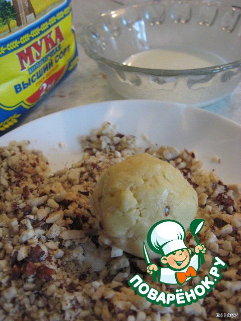 Шарик с одной стороны окунаем с начала в молоко, затем в орешки слегка вдавливая орехи в поверхность.