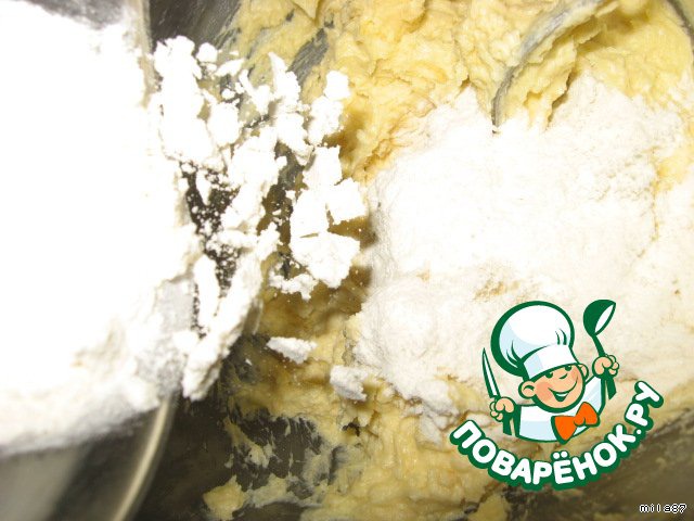 Всыпаем муку, замешиваем тесто.