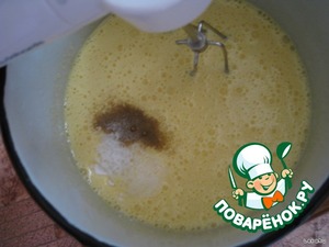 Положить чайную ложку гашеной соды. И для аромата корицу (или ванилин). Перемешать. Затем муку и тщательно перемешать до однородности.