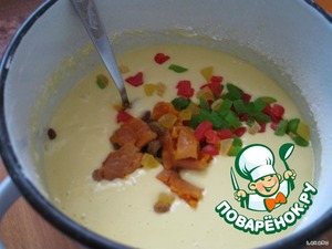 В конце добавить по вкусу сухофрукты (изюм,курага...), орешки, и можно кусочки шоколада.... Вылить в форму,смазанную маслом, и поставить в разогретую духовку (220 град) на 30 минут. Потом проверяйте готовность спичкой. Время выпечки зависит от высоты формы. Я тут выпекала в емкости 20*30, посему пропеклось за 30 минут....