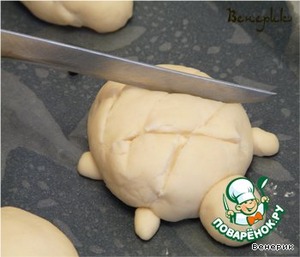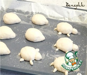 Острым ножом делаем надрезы на спине черепашек, вставляем глазки, перенесите зверюшек на противень, смазанный маслом, смазываем их желтком и отправляем их в разогретую духовку минут на 25