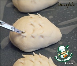 После расстойки теста для ежей ножницами надрезаем сверху колючки, вставляем глазки и носик из черного перца горошка.