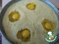 Переложить пюре в смазанную сливочным маслом форму. Сделать в нем 4 углубления и в каждое выпустить по яйцу. |