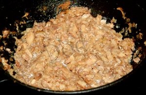 Нарезать мелко грибы и лук. Лук обжарить на растительном масле, добавить грибы. Жарить около 15 мин (чтобы выпарилась жидкость)