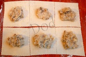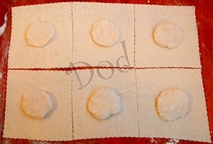 Разрезать тесто на прямоугольники 15х15 см, в серединку положить лепешки из обрезков (чтобы не порвалось дно)