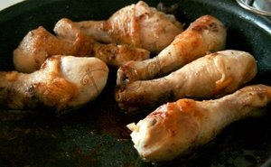 Куриные голени приправить и жарить около 30 минут в растительном масле до готовности