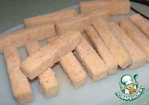 Сыр нарезать палочками, размером примерно 2х8 см.