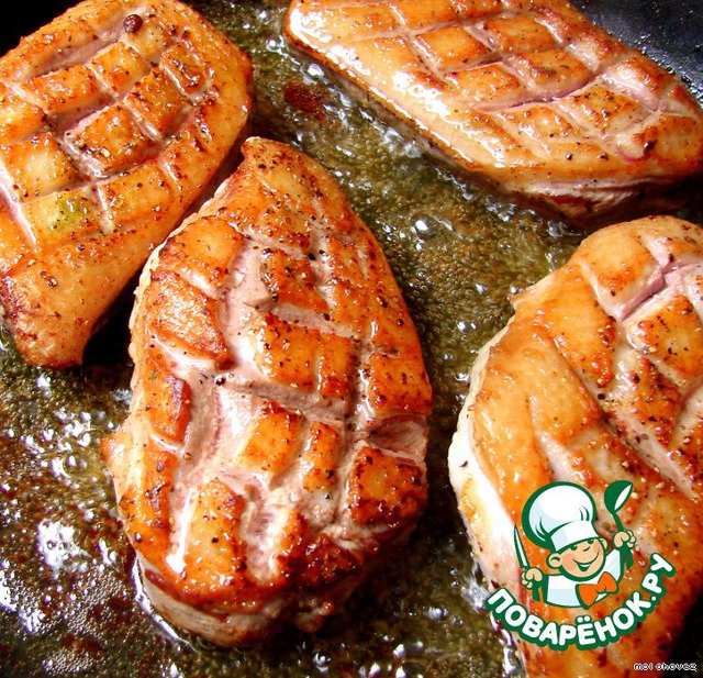 Утиные грудки разложить на столе и сделать надрезы крест-накрест со стороны кожи. Поперчить.