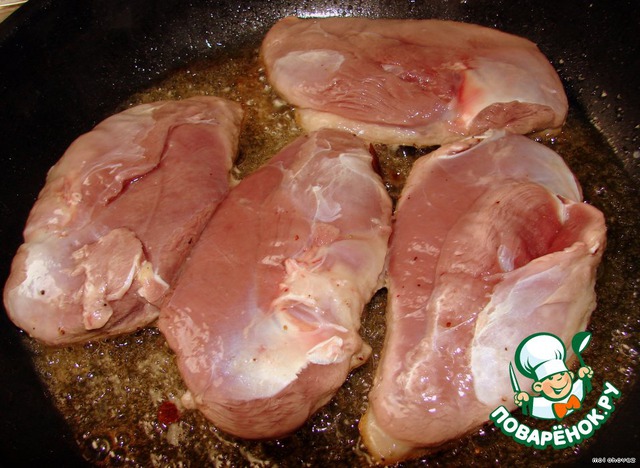 Выложить грудки кожей вниз на очень хорошо прогретую сковороду (маргарин должен уже прогреться, но еще не дымить).