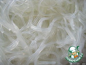 Если готовим гарнир из рисовой вермишели, то варим ее около 5 мин. Если отварили заранее, можно промыть холодной водой и отложить.