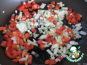 На хорошо разогретом масле обжарим мелко нарезанный лук, чеснок, салатный перец, чили (около 5-7 мин).