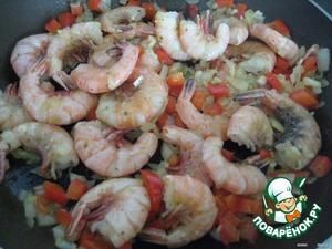 Добавим креветки, перемешаем и жарим еще 3-5 мин, посолим, поперчим.