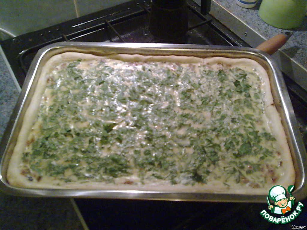 Выложить начинку на тесто и залить яично-сметанной заливкой. Выпекать в духовке при температуре 180 -200 градусов (40 минут).