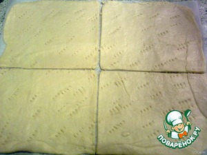 Разделить на 4 части (на фото видно, что корж на весь противень и разделить на 4 части). Тонко раскатать, каждый корж хорошо наколоть вилкой. Испечь в духовке при 180-200* до слегка золотистого цвета. Еще для информации: с этого количества у меня получилось 2 тортика – это 8 небольших коржей!!! А начинку я описала только для одного.