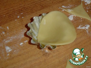 2. Раскатываем тесто и вырезаем кружки по размеру формочек. Выкладываем кружочки в формы, смазанные маргарином, дно прокалываем. Выпекаем при температуре 240 гр. , до золотистого цвета.