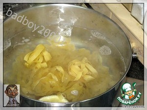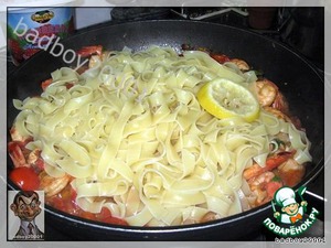 • А где Вы спросите синхронное приготовление, а вот сейчас и начинается, воду посолить, добавить кусочек лимона и закладываем пасту, как любили петь пять минут, пять минут, это много,это много ( мужчины), это мало,это мало ( подхватывали женщины), но это в кино Рязанова, нам надо даже чуть меньше пяти минут.