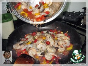 • добавляем на сковородку КРЕВЕТКИ, и нарезанные пополам оставшиеся помидоры.