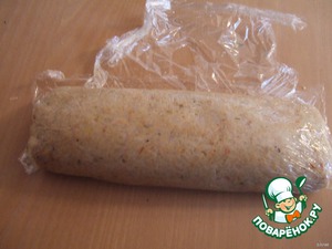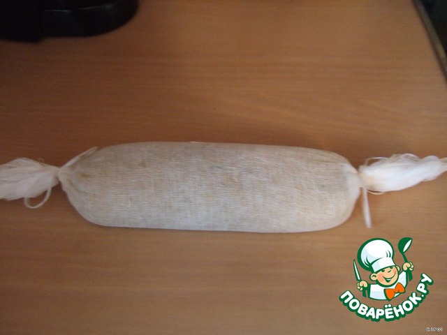 Теперь нам необходимо взять полотняную тряпочку или марлю (я её сложила вдвое) и перекатить наш рулет на неё, завернуть и завязать как конфетку. Вся эта процедура прошла без осложнений, но думаю, что в следующий раз марлю постелю под плёнку и, таким образом, просто перекачу. Но и в этот раз всё обошлось :-)