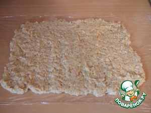 На пищевую пленку выкладываем фарш и размазываем в тоненький слой (не дырявый)