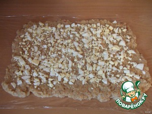 Теперь наш разноцветный пласт завернём, с помощью пленки, в рулет. Заворачивается он достаточно легко.