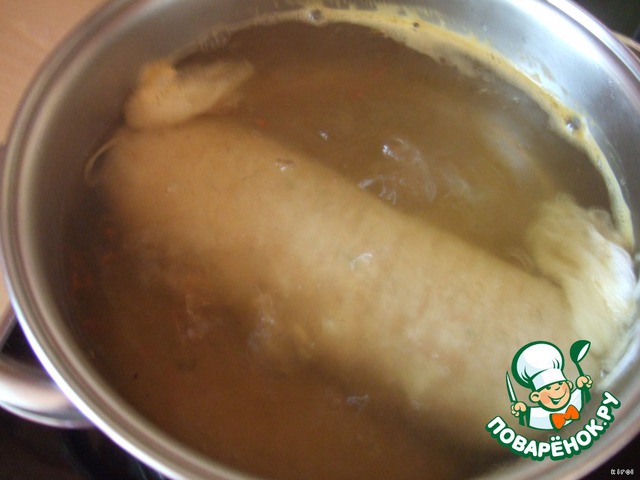 Теперь будем варить наш рулет 20 минут (слабое кипение). Опускаем в кипящую воду. Чуть-чуть подсолить и я добавила специи для рыбы. На кухне стоял такой аромат...Никто и не догадался что это кальмары. Когда рулет будет готов, его необходимо вытащить, остудить, развернуть (остывший!).