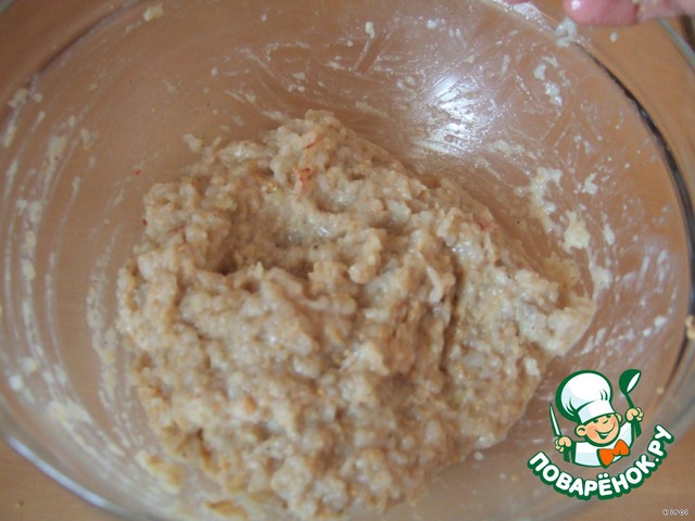 Пропустим через мясорубку кальмаров, размягченный в молоке хлеб (жижку, если есть, не сливайте в фарш), лук и чеснок. Посолить, поперчить и хорошо перемешать. Фарш получается жидковатый.