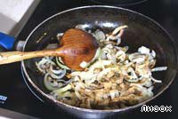 Лук очистить и нашинковать кубиками. Тушить в разогретом оливковом масле около 10 мин, непрерывно помешивая. Посыпать оставшейся зеленью, приправить и выложить в смазанную маслом форму для запекания. Нагреть духовку до 200 градусов.