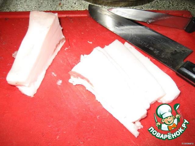 • Берём свиное сало (так как дичь нежирная обычно) и тоже режем его кубиками, но чуть-чуть покрупнее, чем мясо...