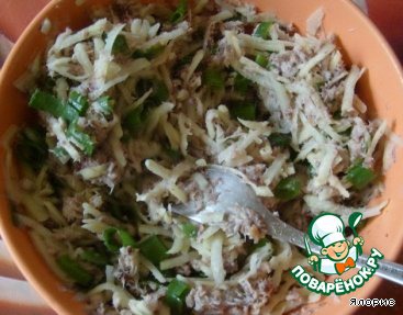 Разминаем вилкой рыбные консервы, перемешиваем с мелко нарезанным зеленым луком и крупно натертым сырым картофелем, солим.