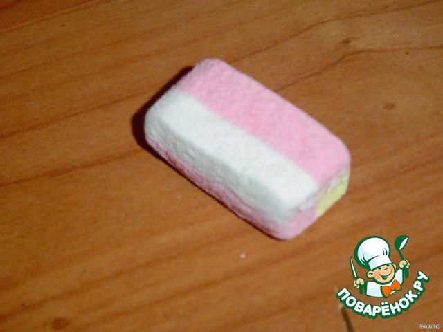 Надрезаем с одной стороны (это будет рот) и вставляем кусочек розового маршмеллоу, в виде язычка.