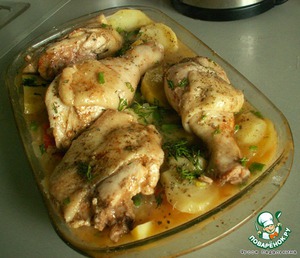 Переложить в жаропрочную форму, посолить, поперчить, посыпать зеленью, сверху выложить куриные ножки.
