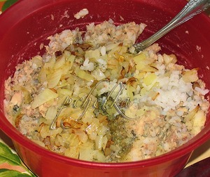 Лук мелко нарезать и обжарить, добавить к рыбе,
