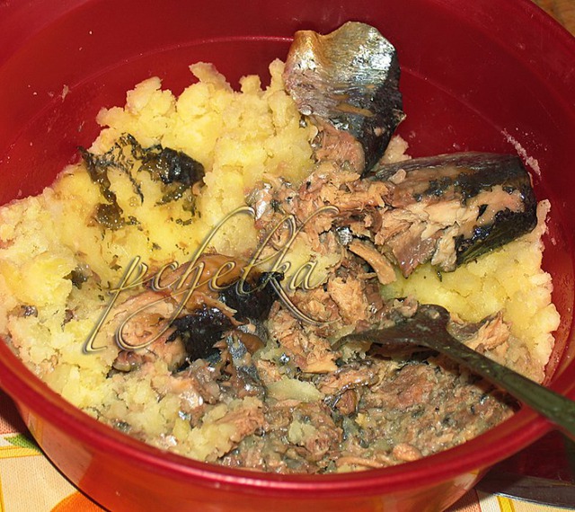 Размять рыбку вилкой, добавить толчёную в пюре картошку, перемешать