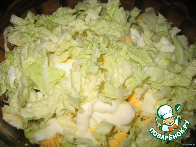 И засыпаем яйца. Далее выкладываем третий слой зеленого салата,