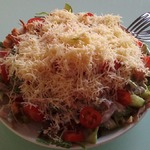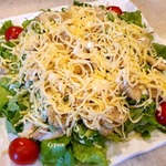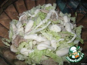 зелень,курочка, яйца, майонез каплями,сверху сухарики и сыр тертый....Удачи!!!