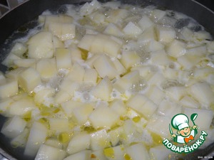 Режем картофель кубиками, доливаем воды так, чтобы почти закрыла картошку. Добавить немного оливкового масла, довести до кипения. Ждем, пока выкипит вода и картофель почти будет готов, солим.
