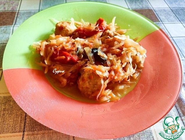 Капусту в отдельной посуде залить крутым кипятком и дать потомиться минут 5. Это я делаю для того, чтобы избавиться от молочной кислоты, которая виновата в том, что от капусты "пучит". Добавить капусту, слив воду через дуршлаг.