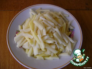 С окорочков снять кожу, она не понадобится, срезать мясо (из него будем делать котлетки), но не всё. Из косточек сварить бульон. У меня была 4х литровая кастрюля. Картофель почистить, нарезать. -