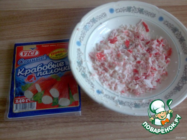 Крабовые палочки натереть на терке или нарезать (после приготовления могу сказать, что лучше резать, чтобы было больше вкуса именно палочек)