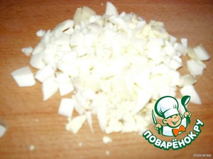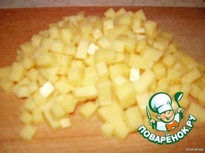 Куриную грудку отварить в подсоленной воде, отделить от костей и нарезать небольшими кубиками