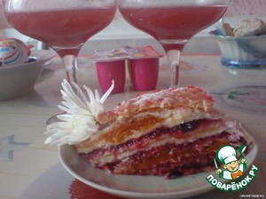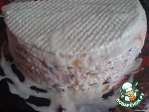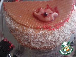 Порезать пополам коржи, сложить друг на друга, смазать в любой последовательности разными начинками. Я смешивала сгущенку с маслом, сметану с смородиной и сахаром, абрикосовое варенье. Все зависит от вашей фантазии. Чтобы торт не был очень сладким чередовала сметанные коржи с мякотью и цедрой лимончика. Но помните, вафельные коржи очень быстро размокают и возможно почти не обнаружить сильно пропитанных сметанкой коржиков (как это получилось у меня) остались лишь одни беленькие полосочки))