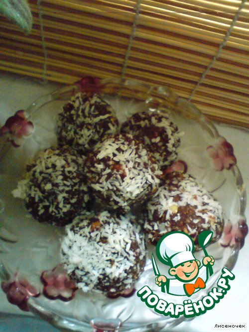 4. скатать шарики, положив внутрь орешек, обвалять в кокосовой стружке и поставить в холодильник минимум на 4 часа.