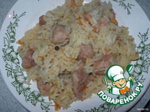 Когда морковь с луком будут готовы, высыпаем в казан рис, предварительно промытый и замоченный в горячей воде в теч. 30 мин. Все перемешиваем и закрываем крышкой до готовности риса (примерно 20 мин.). Можно кушать.