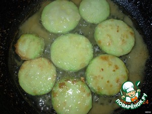 Кабачок порезать кружочками, посолить и дать постоять. Потом обвалять в муке и обжарить в сковороде на растительном масле.