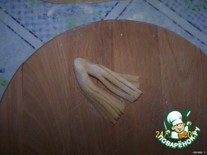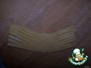 Тесто тонко раскатать, нарезать на полоски длиной не более 10 см и шириной 2-3 см. Сделать надрезы в виде бахромы
