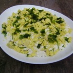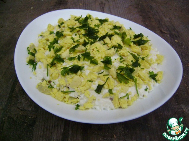 3 слой. Берeм яичные белки и натираем их на крупной терке, затем снова майонез. Сверху украшаем желтком и зеленью на ваше усмотрение. Желток я растирала.