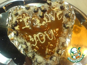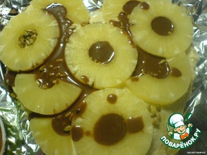 После полной готовности наших коржиков, на блюдо, кладем 1-й корж, обмазываем не толстым слоем крема, накрываем 2-м коржом, намазываем обильно кремом, раскладываем густенько ананасы (кольца, консервированные) в незакрытые места добавляем орешки...семечки...что хотите. Я добавляла кедровые орешки и семечки(очищенные). Аромат хороший. Все это замазать, просто залить кремом густым слоем, полить горячим шоколадом (только шоколад готовьте заранее, не лейте горячим, все поплывет). Посыпаем края кокосовой стружкой (в сочетании...с кремом и шоколадом, как баунти получается). Можно потереть цедру лимончика, для приятной кислинки, я украсила вишнями, получилось тоже хорошо.
