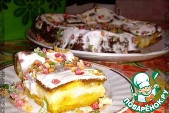 2 стакана сахара и 4 яйца взбить (гоголь-моголь выделываем)))). Разделить все содержимое на две неравных части. Меньшую взбить до густой желтой пенки. Большую часть разделить пополам, в первую половинку добавляем молоко (чуть больше пол стакана) и муку (10-11 ст.л). Хорошо перемешиваем до густоты хорошей густой сметаны, вливаем в формочку и в духовку на 180 С на 20 мин до полуготовности. В это время,во вторую часть вмешиваем сливочное масло (5 ст.л), остатки молока, муку примерно 5 ст.л., ваниль. Все хорошенько перемешиваем в однородную массу, вливаем в формочку и в духовку на такую же температуру на 30-35 мин. До готовности.
