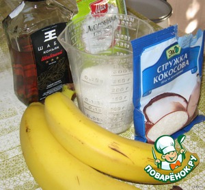 • Из воды, коньяка, лимонной кислоты и сахара варим сироп. Кладем колечки банана в сироп и быстренько обмакиваем в кокосовой стружке.